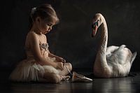 In het betoverende schijnsel van een balletstudio komt de jeugdige ballerina naar voren, haar concentratie volledig gericht op het zorgvuldig aantrekken van haar balletschoenen. Als een ritueel van toewijding lijken de handelingen te resoneren met de diepe symboliek van opgroeien en de zoektocht naar perfectie. Naast haar, als een schim van gracieuze melancholie, staat een zwaan, haar aanwezigheid symboliseert de vloeiende overgang tussen kindertijd en volwassenheid, tussen aards en etherisch.
