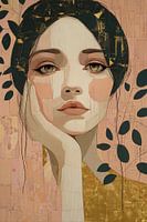De zachte kleuren van huid en achtergrond, gecombineerd met de gouden accenten, suggereren dat deze droom niet enkel melancholisch is, maar ook verheven en kostbaar. Het goud fungeert als een symbool van het ongrijpbare: datgene wat de werkelijkheid overstijgt en het alledaagse verandert in iets eeuwigs. De donkere bladeren omlijsten het gezicht en lijken deel te nemen aan dit dromen; ze herinneren aan groei, cyclus en verbondenheid met de natuur.