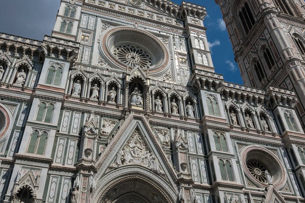 De Duomo van Florence, de mooie Venetiaans Romaanse dom kerk in Toscane. Deze erg mooie kerk in het hart van Florence, staat hier erg mooi in de zon in de zomer. De blauwe lucht, net met dat ene wolkje, geeft deze foto wel een erg lekker vakantie gevoel mee.
