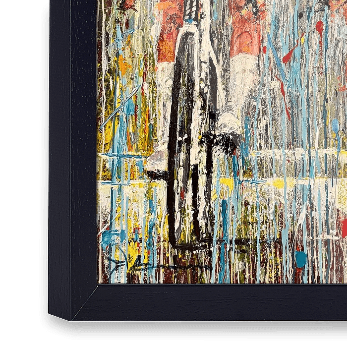 Acryl met paletmes op canvas. Origineel formaat 120 x 160 cm. Spanning en snelheid op het beslissende moment in het wielrennen.
