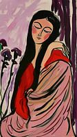 De kunstenaar gebruikt gedurfde, vloeiende lijnen en een levendig kleurenpalet om de figuur en haar omgeving vorm te geven. Haar gezicht is vereenvoudigd weergegeven met gesloten ogen en opvallend roze wangen, wat haar een…