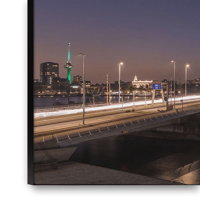 De Erasmusbrug in Rotterdam in de avond. Dit werk is onderdeel van de fotocollectie van MS Fotografie. Klik rechts op "Alle werken" om meer werken uit de collectie te zien.