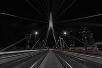 De Erasmusbrug in Rotterdam in de avonduren met lichtstrepen. Dit werk is onderdeel van de fotocollectie van MS Fotografie. Klik rechts op "Alle werken" om meer werken uit de collectie te zien.