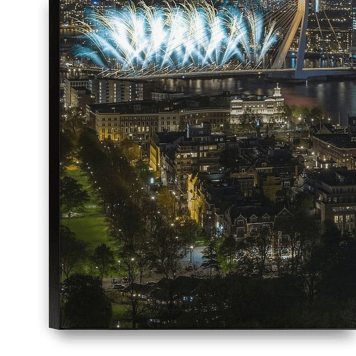 De Erasmusbrug in Rotterdam in de kleur goud met vuurwerk speciaal voor 10 jaar Werk aan de Muur. Dit werk is onderdeel van de fotocollectie van MS Fotografie. Klik rechts op "Alle werken" om meer werken uit de collectie te zien.