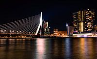 De Erasmusbrug in Rotterdam tijdens de avonduren. Het water is mooi glad door de lange sluitertijd die gebruikt is tijdens het maken van de foto. De Erasmusbrug wordt ook wel de Zwaan genoemd door de bijzondere vorm van de brug.