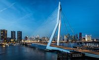 De Erasmusbrug met de Rotterdamse skyline tijdens het blauwe uurtje.
