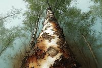 Verticaal natuurkunstwerk van een berk gezien van onderaf, met witte stam en groene kruin in zachte mist, ideaal als serene wanddecoratie.