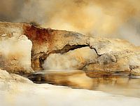 Dromerig abstract kunstwerk van een rotsboog in warme oker- en goudtinten boven stil water, ideaal als mystieke wanddecoratie.