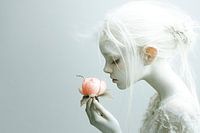 “De Fluistering van de Rozenknop” is een betoverend fine art portret van een porselein-achtig meisje met sneeuwwit haar dat teder een zachtroze rozenknop ruikt. Perfect als moderne muurdecoratie slaapkamer, sfeervolle kunstprint meisjeskamer, groot formaat canvas sprookjesportret of limited edition giclée-print Scandinavisch interieur.