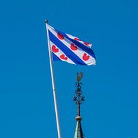 Een wapperende Friese vlag en de kerktorenspits van het Friese dorpje Cornwerd aan het IJsselmeer met een staalblauwe achtergrond.