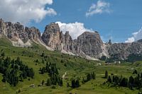 Groene weides in de Gardena pas aan de voet van de imposante rotsformaties van de Dolomieten in Zuid-Tirol.