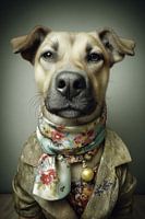 Met een sierlijke sjaal en een medaillon straalt deze hond de rust en scherpte van een kunstkenner uit. Zijn blik is gefocust, alsof hij net een barok meesterwerk heeft geanalyseerd. Een subtiele ode aan kennis, stijl en verfijning.