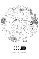 Zwart-witte landkaart, stratenplan of plattegrond van De Glind. De Glind is gelegen op de Veluwe, in de gemeente Barneveld, provincie Gelderland. Op de stadskaart zijn alle openbare wegen in De Glind opgenomen. Verder is de kaart voorzien van de coördinaten van het centrum van De Glind.
