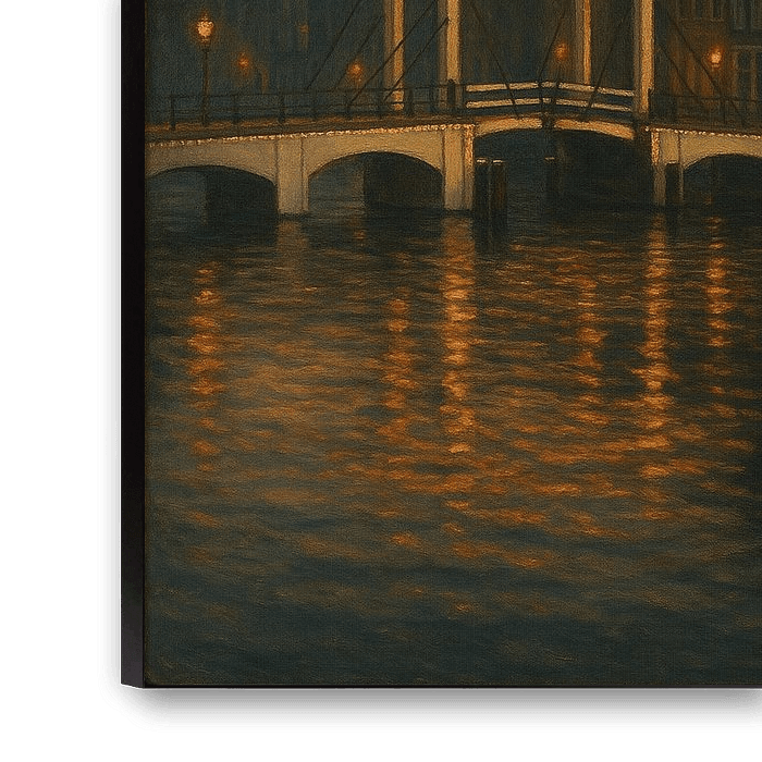 De Gouden Gloed van Amsterdam baadt de gevels en bruggen van de stad in een amberkleurige gloed die de tijd zelf lijkt op te schorten. Het water weerspiegelt het licht met zachte rimpelingen en de stilte draagt zowel rust als melancholie in zich. Dit is Amsterdam gezien door het emotionele realisme van Edward Hopper, waar architectuur, licht en eenzaamheid samenkomen in stille poëzie.