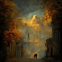 Betoverend dromerig kunstwerk van een herfststraat in warm goud-oranje licht met twee wandelende silhouetten onder een dramatische hemel, ideaal als magische wanddecoratie.
