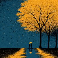 Romantisch en magisch kunstwerk van twee silhouetten met een gele paraplu onder een enorme gouden boom terwijl goudgele blaadjes als regen vallen in een diepe blauwe nacht, ideaal als warme wanddecoratie.