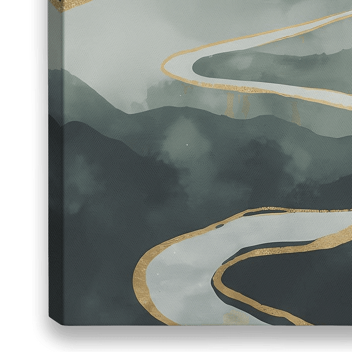 De Gouden Rivier is een betoverend en sfeervol kunstwerk dat de kijker meeneemt in een dromerig berglandschap waar licht en beweging elkaar versterken. De zacht gelaagde heuvels, weergegeven in kalme tinten blauwgroen en mistig grijs, vormen een serene achtergrond die langzaam oplost in de zachte pastellucht boven het tafereel. De…