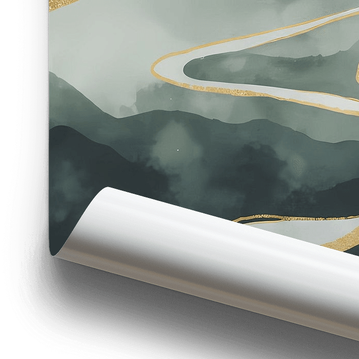De Gouden Rivier is een betoverend en sfeervol kunstwerk dat de kijker meeneemt in een dromerig berglandschap waar licht en beweging elkaar versterken. De zacht gelaagde heuvels, weergegeven in kalme tinten blauwgroen en mistig grijs, vormen een serene achtergrond die langzaam oplost in de zachte pastellucht boven het tafereel. De…