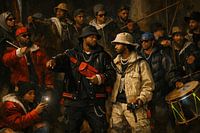 De meest uitgesproken versie van de Nachtwacht-reeks: Rembrandts schutters zijn volledig getransformeerd tot hiphop-iconen. Zware kettingen, leren varsityjassen, bucket hats en oversized sieraden domineren het beeld. De twee centrale figuren stralen autoriteit en zelfvertrouwen uit, terwijl de groep op de achtergrond poseert met de…