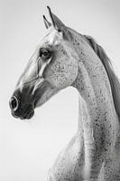 Dit kunstwerk toont een schitterend portret van een gevlekte Arabische volbloed, vastgelegd in een verfijnde zwart-wit compositie.