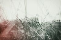 Dit krachtige, abstracte beeld vangt de grens tussen twee werelden. De focus ligt op de onmiddellijke voorgrond: lange, onscherpe grassprieten creëren een dramatische textuur en belemmeren het zicht op het hekwerk en het landschap daarachter. Het beeld is gedomineerd door een hoge belichting en een vervaagd, monochroom kleurenpalet met…