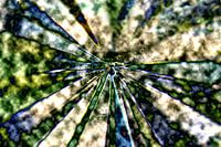 Digitale kunst en het artistieke werk van digitale technologie. De eindeloze groene tunnel, ljnen in levendige groen en blauw met aardetinten. Dit alles op een lichte achtergrond geprojecteerd.