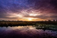 Nationaal park de Groote Peel op de grens tussen Limburg en Noord-Brabant. Paarse zonsopkomst in Nederland. Nederlands landschap.