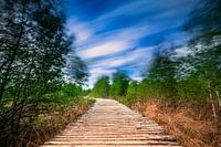 Storm in de groote peel met waaiende bomen en wolken. Natuur en landschap van Limburg en Noord-Brabant met houten pad door veen, bos, heide en vennen.