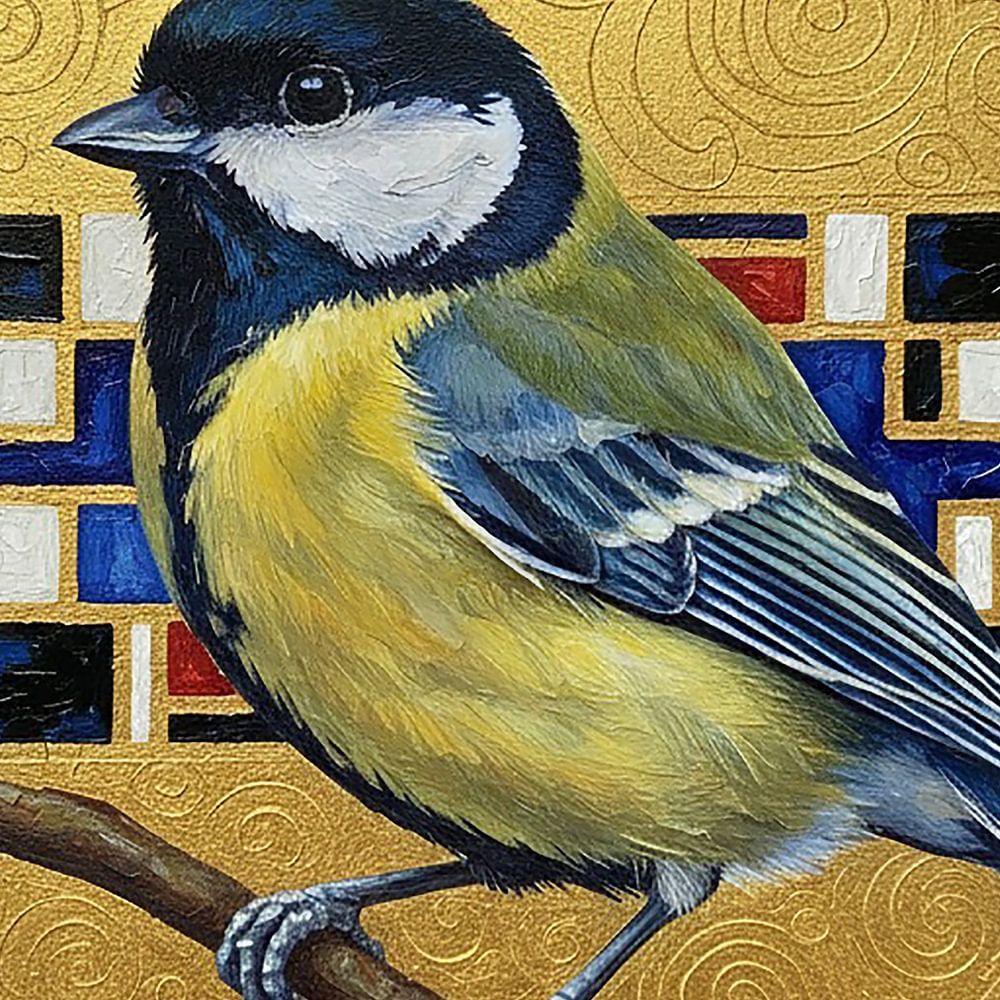 Dit schilderij is een meesterlijke samensmelting van natuurlijke schoonheid en decoratieve kunstgeschiedenis. De centrale figuur is een majestueuze Koolmees (Parus major), geschilderd in rijke, gelaagde texturen van helder geel, diepblauw en zwart. De vogel straalt door zijn realistische weergave en levendige kleuren.