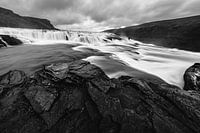 Deze zwartwit foto is gemaakt met lange sluitertijd om het snelstromende water van de waterval een bijzonder effect te geven.