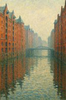 In het statige pakhuisdistrict van Hamburg drijft ochtendmist als een herinnering tussen rode bakstenen muren. Het kanaal weerspiegelt zachte tinten koper en jade, de lucht is dicht met zout en stilte. De kunstenaar schildert deze maritieme geometrie zoals Monet Rouen geschilderd zou kunnen hebben - industriële schoonheid verlost door licht.