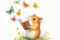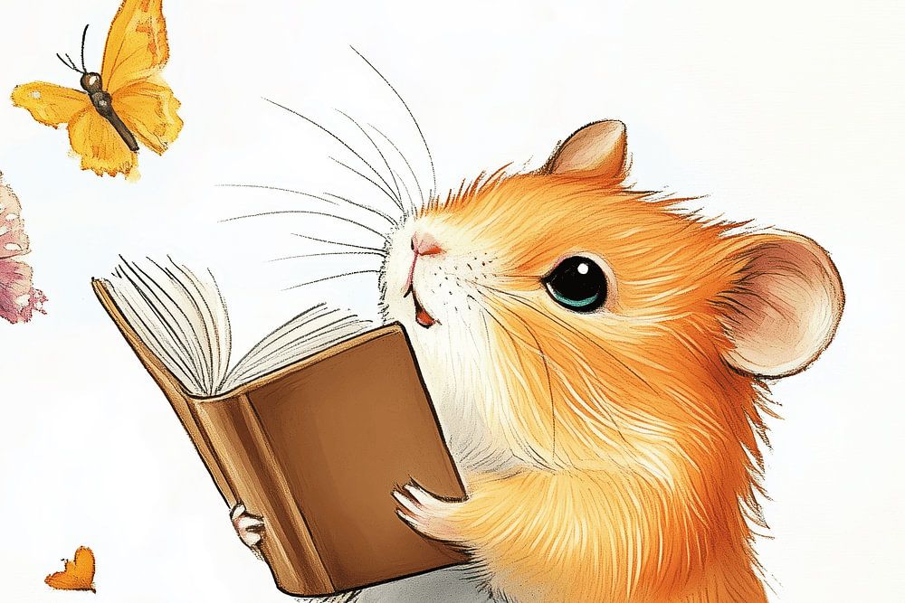 Onder een heldere hemel, omringd door kleurrijke bloemen, zit een kleine hamster met een open boek voor zich. Het boek, met levendige illustraties van vlinders, heeft duidelijk de aandacht van de hamster getrokken. Om hem heen fladderen diverse vlinders in allerlei kleuren en maten, als een levendige illustratie van de pagina's die hij aan het lezen is. De hamster kijkt omhoog, zijn oogjes volgen de elegante bewegingen van de vlinders die als dansende juwelen in de lucht zweven. De omgeving is sereen, met een zacht briesje dat de bladeren en bloemen doet ritselen. De scène straalt een gevoel van verwondering en ontdekking uit, en benadrukt de vreugde van het lezen en leren over de natuur. Deze tekening is een ode aan de magie van boeken en de natuurlijke wereld, en nodigt kinderen uit om hun nieuwsgierigheid te omarmen.
