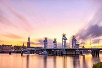 De oude Hanzestad Kampen aan de rivier de IJssel net na zonsondergang. De lichten van de stad worden gereflecteerd in het water in de voorgrond door de lange sluitertijd. Kampen is een oude Hanzestad met tal van monumentale gebouwen en pittoreske straatjes.