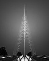 Een Zwart-Wit foto van de Harpbrug, een van de drie naast elkaar liggende bruggen over de Hoofdvaart. Alle drie ontworpen door Santiago Calatrava. Deze drie bruggen waren allemaal vernoemd naar muzikale instrumenten, de Luit / Luit-brug, de Lyre / Cither / Citer-brug en de Harp-brug.