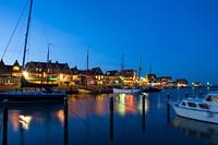 De Haven van Volendam met uitzicht op de Dijk, tijdens het blauwe uur