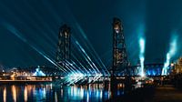 Deze foto legde een prachtig spektakel vast: voorbereidingen voor Eurovisie Songfestival 2021 in Rotterdam. Tijdens deze avond/nacht werden delen opgenomen van de show die later zouden worden uitgezonden. In dit shot was de Hef (die normaal omhoog staat) omlaag, met in het midden een DJ die aan het spelen was. Wat het spectaculair maakte waren de lichten en lasers die een danste over het water.