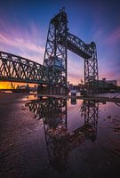 Voormalig spoorbrug en rijksmonument De Hef (eigenlijk de Koningshavenbrug geheten) in Rotterdam, gefotografeerd tijdens een zonsondergang in november. De brug reflecteert in een flinke plas regenwater met wat herfstbladeren. Als je links onder de brug doorkijkt, zie je de Erasmusbrug. De foto is gemaakt met een lange sluitertijd, waardoor de wolken mooi uitgestreken worden. De Hef vormde een verbinding tussen de wijk Feijenoord en het Noordereiland.