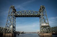 Oude spoorbrug De Hef in Rotterdam tegen een mooie heldere blauwe hemel. Het groen van het oude, industriele metaal steekt mooi scherp af tegen de lucht.