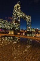 Reflectie van de verlichte Hef in een regenplas.