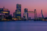 De skyline van Rotterdam met de Erasmusbrug, de Hef, het KPN-gebouw en de Maastoren gefotografeerd met lange sluitertijd bij zonsondergang.