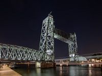 Avondopname van de Hef in Rotterdam terwijl er een containerschip onder de brug door vaart.