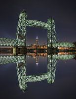 De nieuwe Zalmhaventoren is hier in het midden van de Hefbrug in Rotterdam geplaatst. De spiegeling maakt het beeld symmetrisch. De foto is op een koude avond winteravond gemaakt, de kleuren van de brug knallen mooi tegen het donker van de lucht.