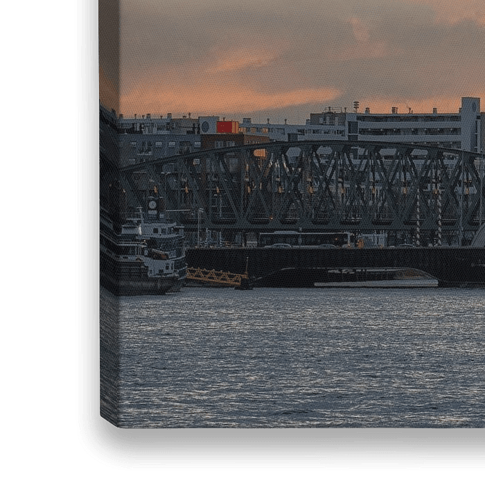Tijdens zonsondergang op kerstavond een klassiek stukje Rotterdam op de gevoelige plaat vastgelegd. De brug steekt mooi af op de lucht die nog door de ondergaande zon wordt opgelicht.