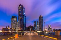 De Kop van Zuid vroeg in de ochtend. vlak voor zonsopkomst. Het blauwe uurtje is in volle gang en de wolken beginnen kleur te krijgen.