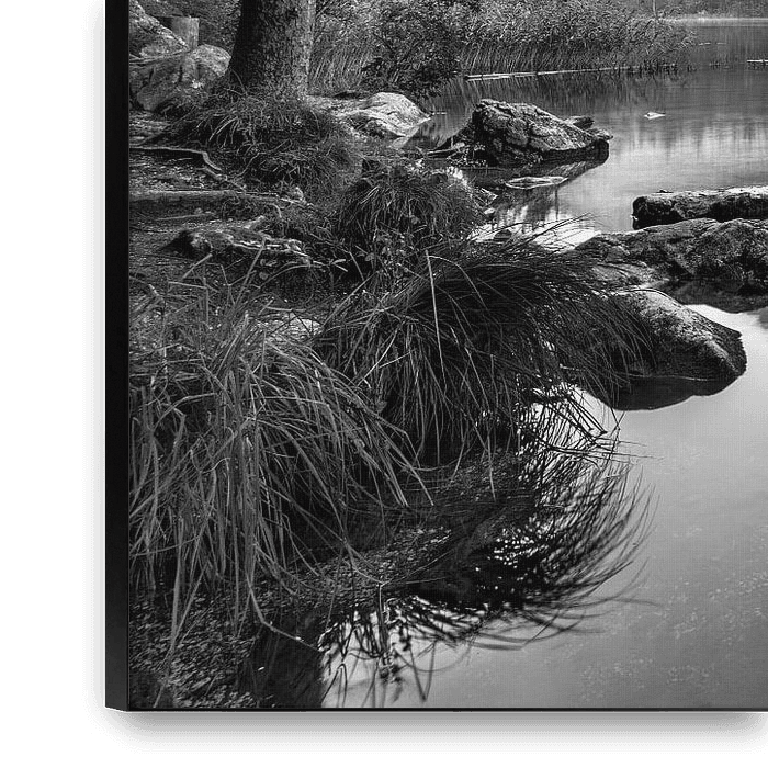 Koop dit landschapskunstwerk De Hintersee in Beieren bij Ramsau in zwart-wit. van Manfred Voss, Zwart-Wit Fotografie op canvas, aluminium dibond, (ingelijste) fotoprint, behang en ArtFrame, op maat geprint in Fine-Art kwaliteit.