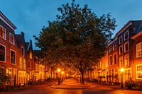 De warme verlichting kleurt de bakstenen gevels en de bladeren in tinten van goud en oranje, terwijl de schaduwen zacht vervagen in het steeds donker wordende blauw van de avond. De statige panden langs de gracht reflecteren het rustige karakter van deze oude straat en versterken de indruk van een tijdloze, intieme plek midden in de stad. De bomen, gehuld in de tinten van de straatverlichting, vormen een beschutte wandelroute die perfect aansluit bij de charme van het blauwe uur.