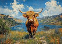 Olieverfschilderij van een schattige hooglandkoe voor een meer en groene heuvels, met blauwe lucht en witte wolken, een grasland en wilde bloemen. Het schilderij heeft een gedetailleerde vachttextuur en natuurlijk licht dat schaduwen werpt op de vacht van de koe, wat resulteert in levendige kleuren en fijne details in vintage-stijl.