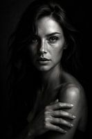Dit krachtige zwart-wit portret ademt emotie, mysterie en tijdloze schoonheid. De blik van het model is doordringend en bijna hypnotiserend, waardoor dit kunstwerk onmiddellijk de aandacht opeist. De subtiele plaatsing van de hand op de schouder voegt een menselijke kwetsbaarheid toe die perfect in balans staat met de sterke, zelfverzekerde uitstraling van het gezicht.