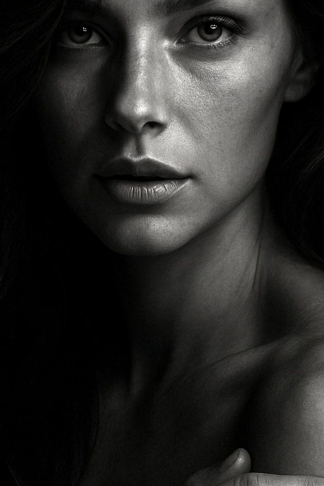 Dit krachtige zwart-wit portret ademt emotie, mysterie en tijdloze schoonheid. De blik van het model is doordringend en bijna hypnotiserend, waardoor dit kunstwerk onmiddellijk de aandacht opeist. De subtiele plaatsing van de hand op de schouder voegt een menselijke kwetsbaarheid toe die perfect in balans staat met de sterke, zelfverzekerde uitstraling van het gezicht.