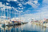 De jachthaven van Juelsminde. Er liggen voornamelijk Deense zeilboten aan de steigers van de haven. Het water weerspiegelt de boten en de lucht. Aan menig mast hangt een Deense vlag.